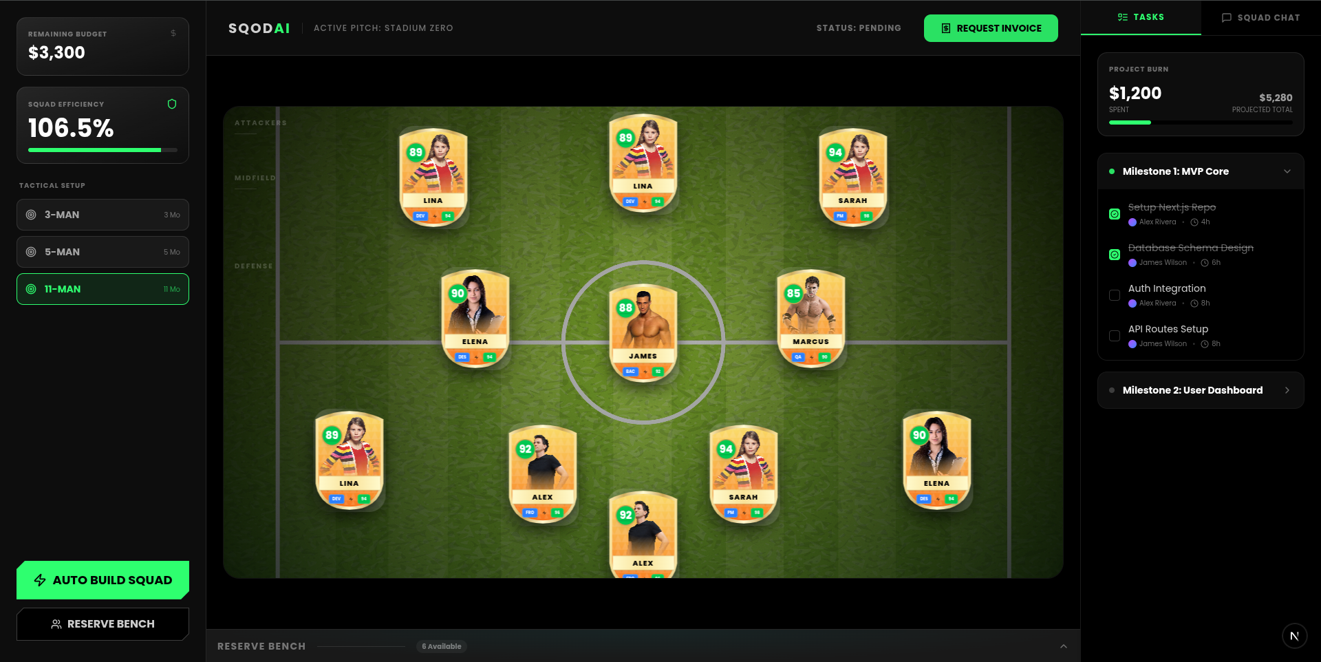 Instant repo access, real-time task board, and unified squad chat. Manage velocity, milestones, and payments from one tactical HUD.